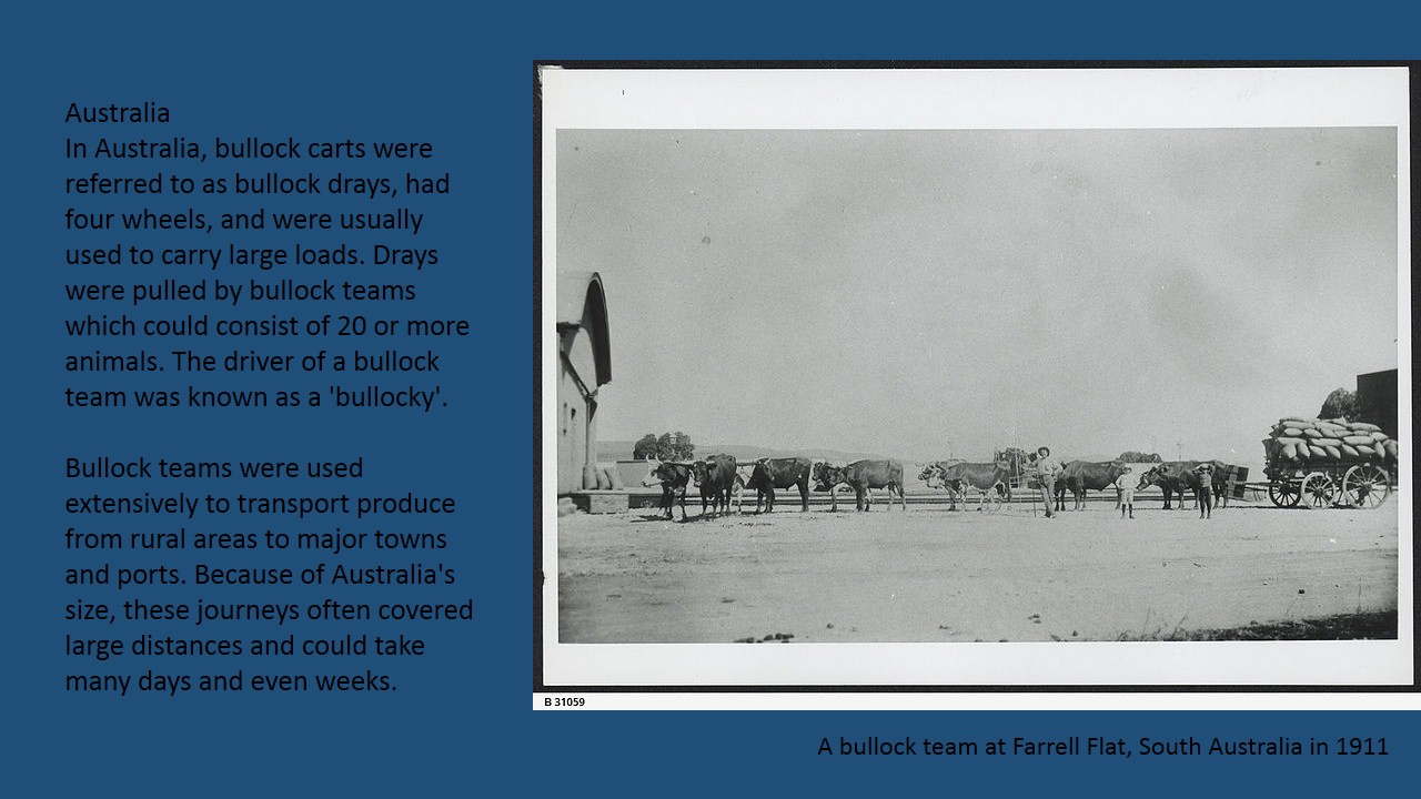 In Australia, bullock carts were referred to as bullock drays, had four wheels, and were usually used to carry large loads. Drays were pulled by bullock teams which could consist of 20 or more animals. The driver of a bullock team was known as a ’bullocky’.