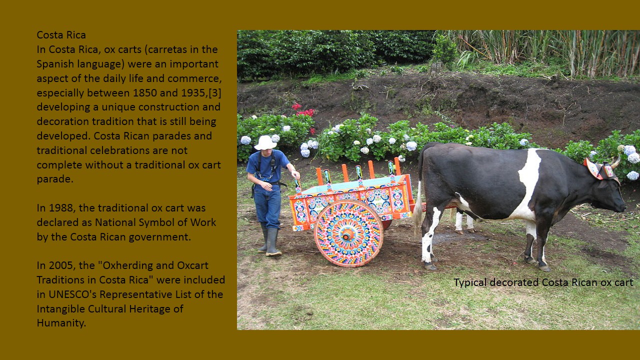 In 2005, the "Oxherding and Oxcart Traditions in Costa Rica" were included in UNESCO’s Representative List of the Intangible Cultural Heritage of Humanity.