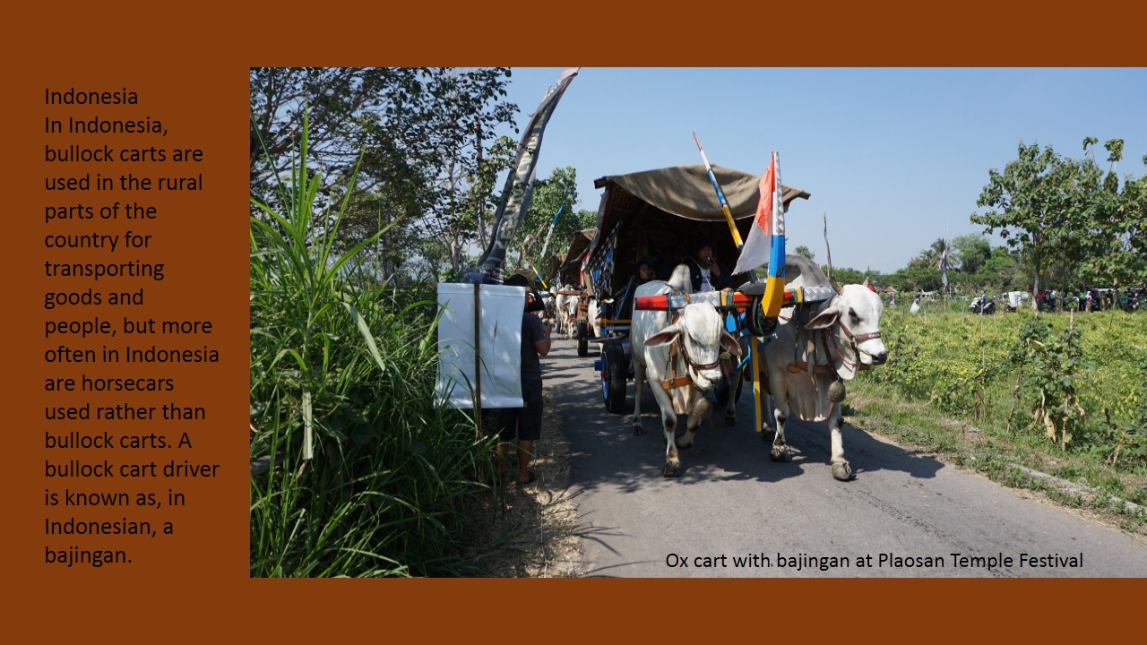In Indonesia, bullock carts are used in the rural parts of the country for transporting goods and people, but more often in Indonesia are horsecars used rather than bullock carts. A bullock cart driver is known as, in Indonesian, a bajingan.