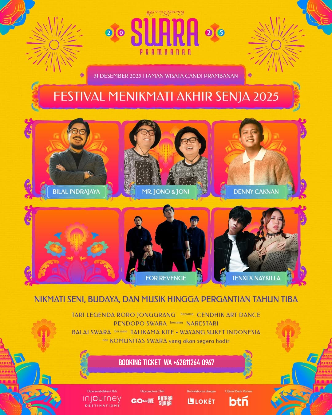 Nikmati malam pergantian tahun dengan sebuah pertunjukan budaya yang megah di Candi Prambanan. Swara Prambanan 2025 menghadirkan edisi spesial malam Tahun Baru dengan kolaborasi musik, tarian, dan pencahayaan artistik yang memperkuat kemegahan candi sebagai latar utama.