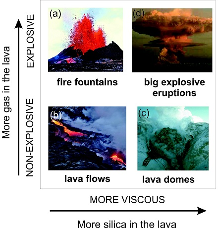 Andesite, dacite, and rhyolite lavas are progressively higher in silica and more viscous, so gases cannot escape gradually. If high-silica lavas contain little trapped gas, they may ooze slowly onto the surface to pile up as steep-sided lava domes.